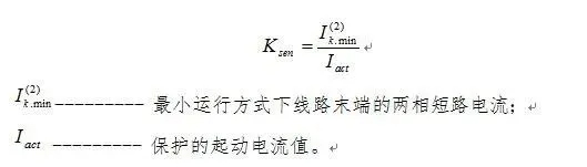 限時速斷保護(hù)是反應(yīng)于電流增大而延時動作的一種電流保護(hù)類型,限時電流速斷保護(hù)要求在系統(tǒng)的最小運行方式下,線路末端發(fā)生兩相短路時,具有足夠的反應(yīng)能力,這個能力通常用靈敏系數(shù)Ksen來衡量,一般要求Ksen≥1.3~1.5,靈敏系數(shù)按下式校驗: