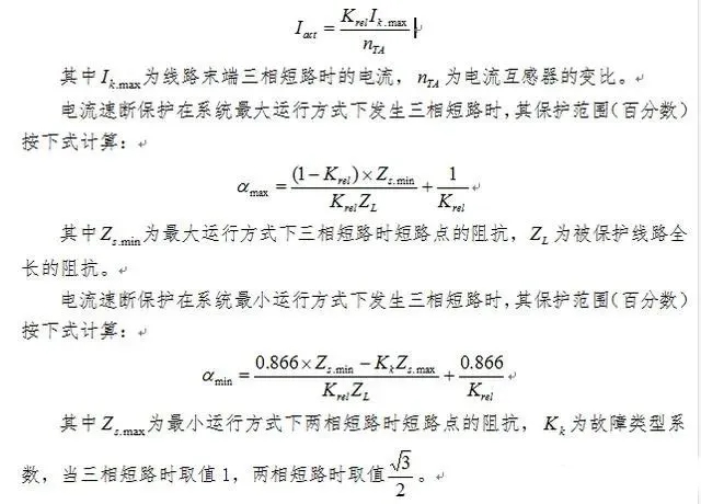 電流速斷保護(hù)是一種僅反應(yīng)于電流增大而瞬時動作的一種電流保護(hù)類型。保護(hù)的按線路末端出現(xiàn)三相短路時的短路電流來整定,取一定的可靠系數(shù)Krel,可靠系數(shù)一般為1.2~1.3,保護(hù)起動電流Iact按下式計算: